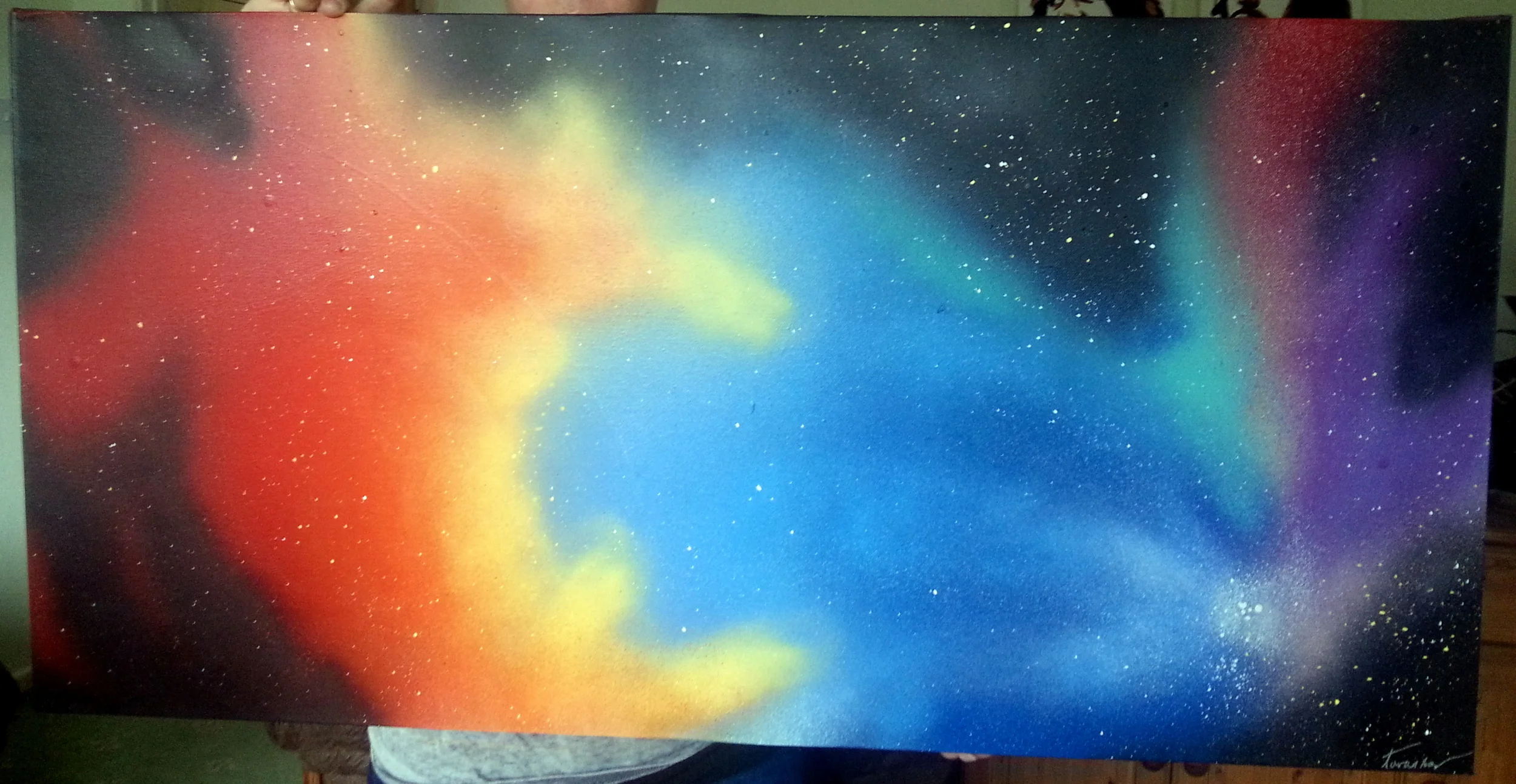 After wondering about new ways to paint, one of my friends showed me a video of a man in the street painting space art with spray paint, that was it! That was what I had been looking for!! I invested in a bunch of cans and did some research on the best methods on using them, and within hours of the cans arriving I had made my first piece of art with spray paint! It wasn't anything amazing, but it was my first attempt and it didn't turn out too horrible :P